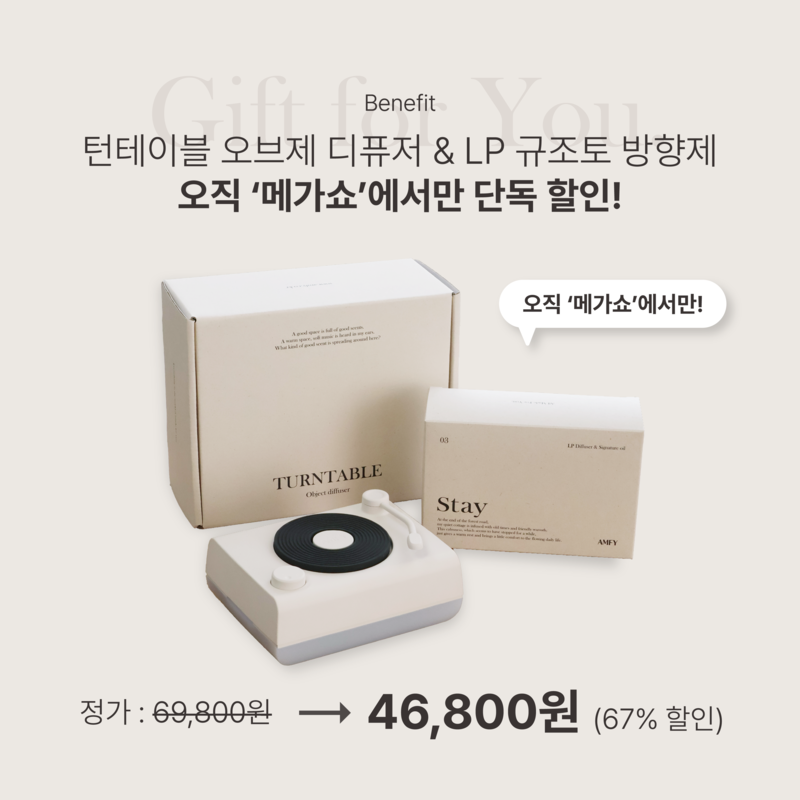 - ✅ 오직 '메가쇼'에서만 '턴테이블 오브제 디퓨저' 67% 할인 진행중!