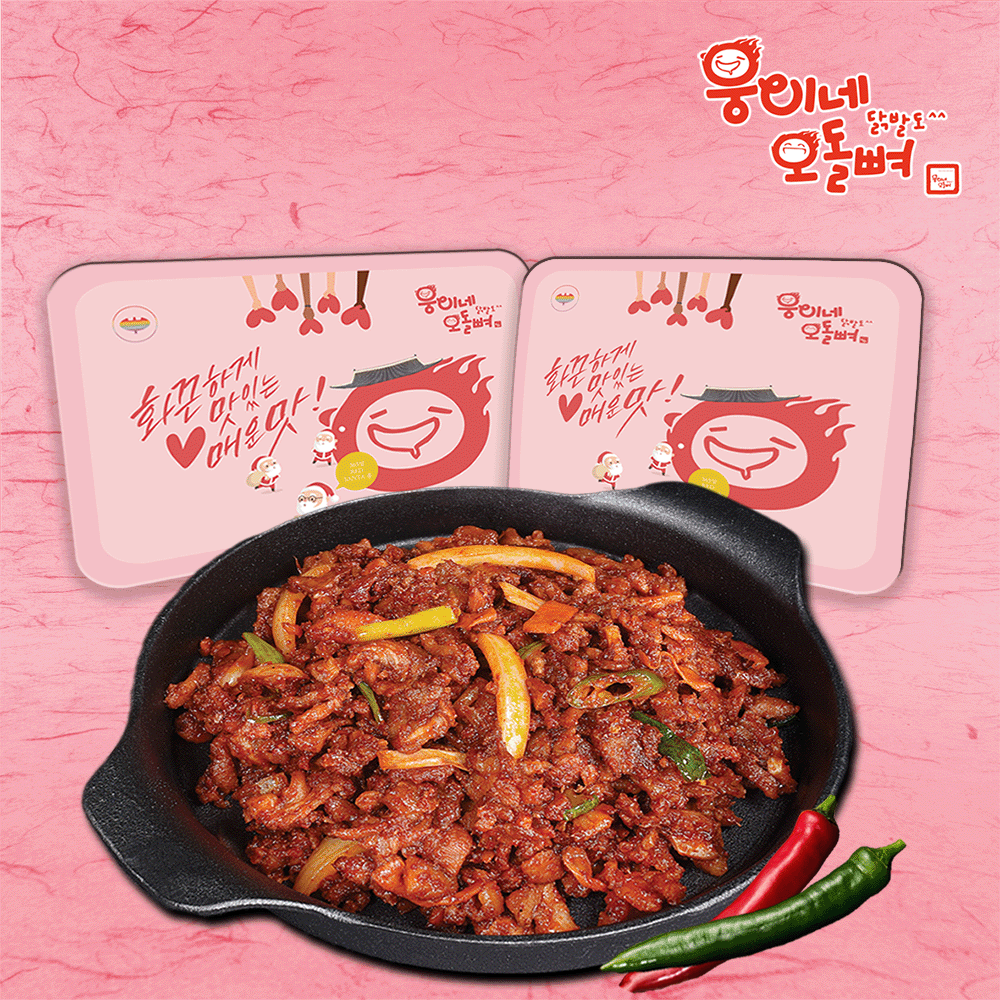 - 국내산 닭발에 웅이네만의 특제소스를 더한 화끈한 불향 가득 무뼈닭발!