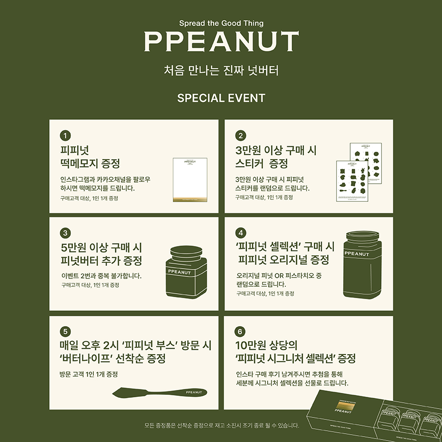 - 1. 5만원 이상 구매 시 '피피넛 피넛버터' 추가 증정