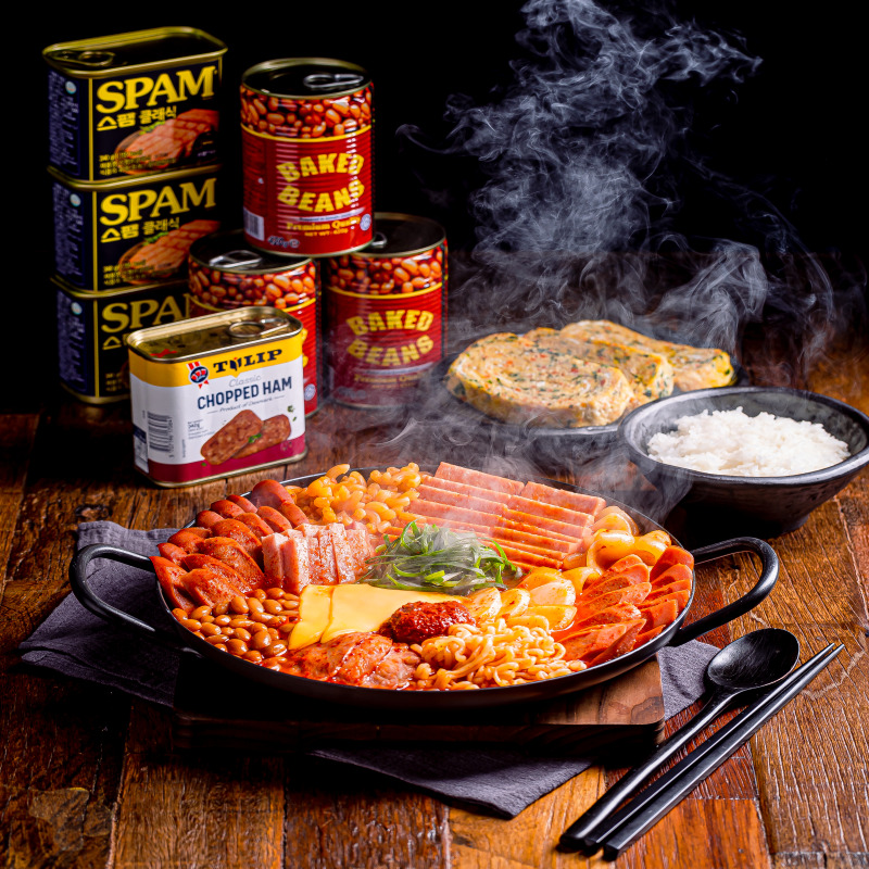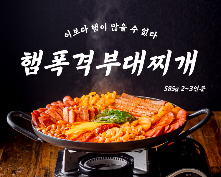 - 햄이 폭탄처럼 푸짐하게! 진한 국물과 진짜 cj 스팸 그리고 든든한 구성으로 집에서도 맛집 퀄리티를 즐길 수 있는 빨간음식연구소 대표 밀키트 [햄폭격부대찌개]