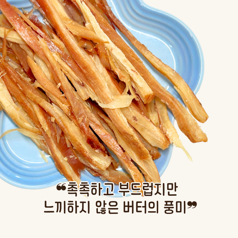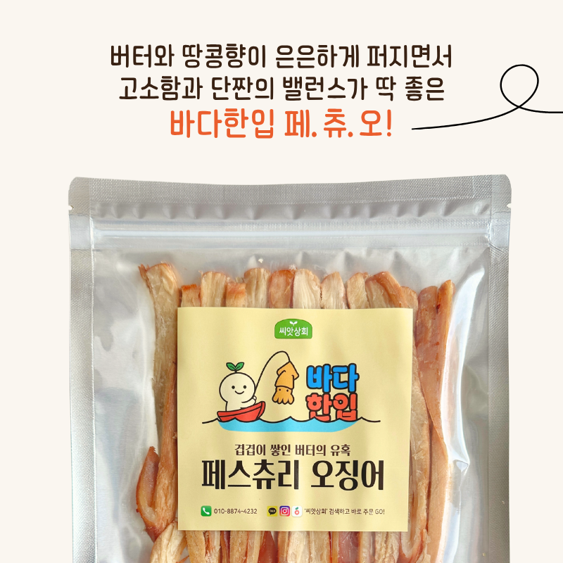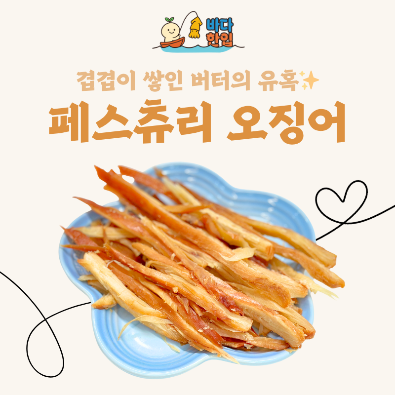 버터와 땅콩향이 은은하게 퍼져 고소함과 단짠의 균형이 좋은 ‘바다한입 페스츄리 오징어’입니다. 겹겹이 쌓여 촉촉하고 부드럽지만 느끼하지 않은 버터 풍미를 즐겨보세요!