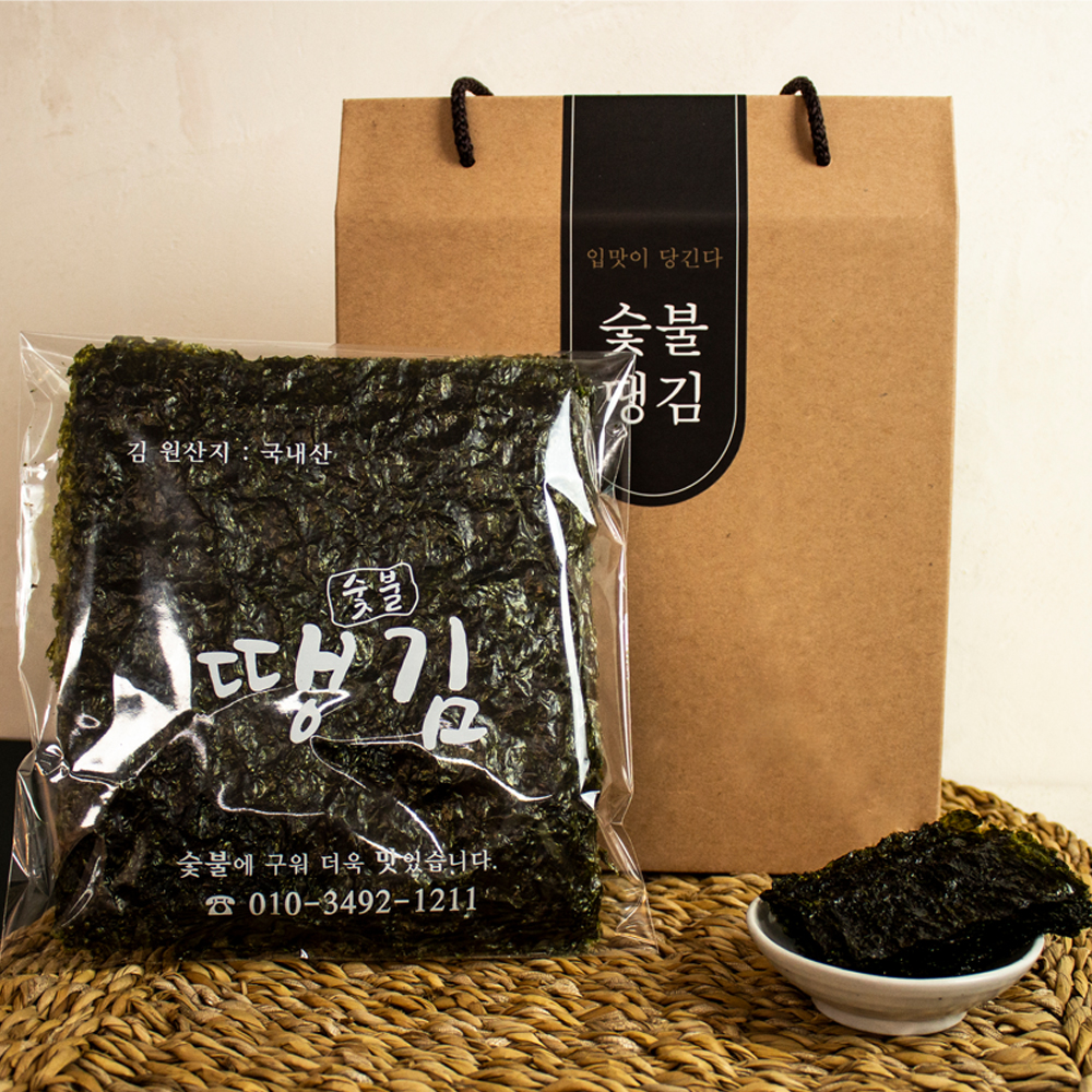 바다향이 가득한 고급 원초에 갓 짠 신선한 들기름, 참기름, 소금을 발라 장시간 숙성시켜 숯불에 직접 한장 한장 구워 입맛 당기는 바삭바삭하고 고소한 수제 숯불김!
