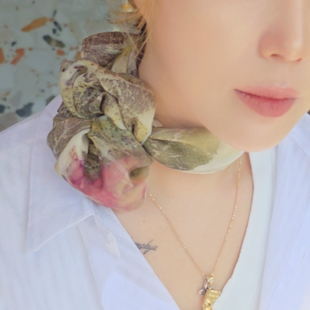 - 자연소재 자연빛깔 바더만 자연결 스카프는 자연의 꽃잎, 나뭇잎을 실크 스카프에 얹어 무늬를 만든 에코프린팅 스카프입니다.