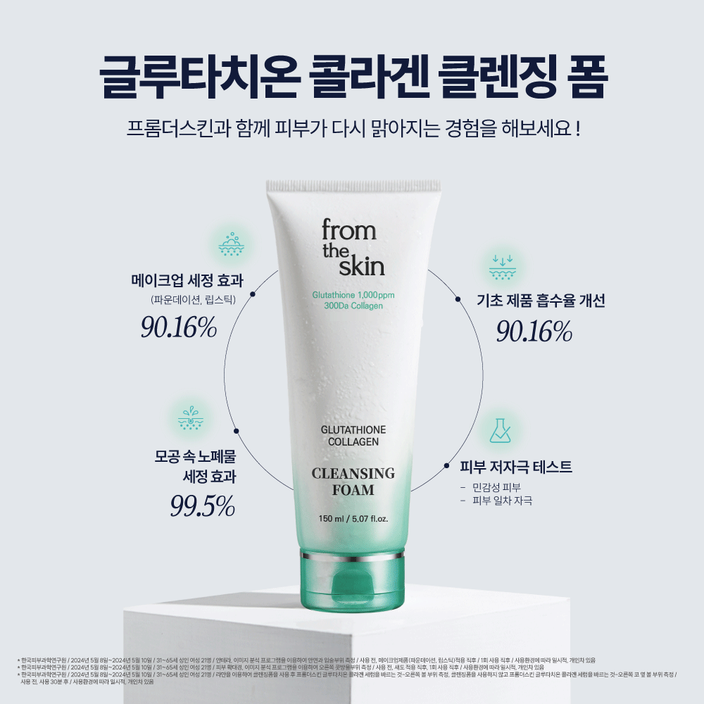 - 글루타치온과 콜라겐이 함유되어 노폐물 제거는 물론 피부톤을 밝히고 탄력까지 케어하는 부드러운 딥클렌징 폼을 프롬더스킨에서 만나보세요!