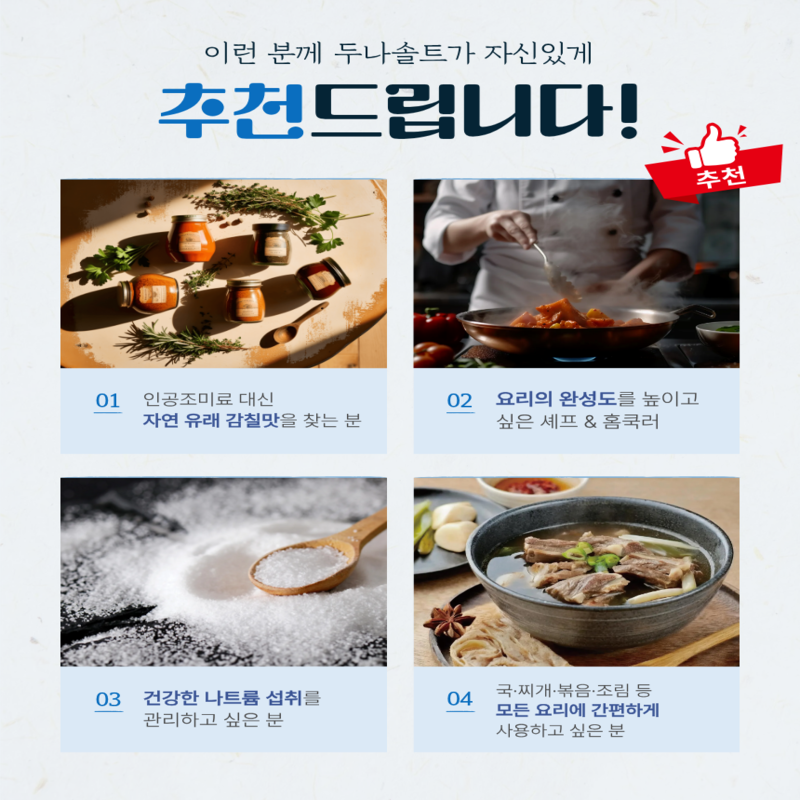 천연 식물성 원료로 나트륨 부담은 줄이고, 미네랄은 풍부하게!