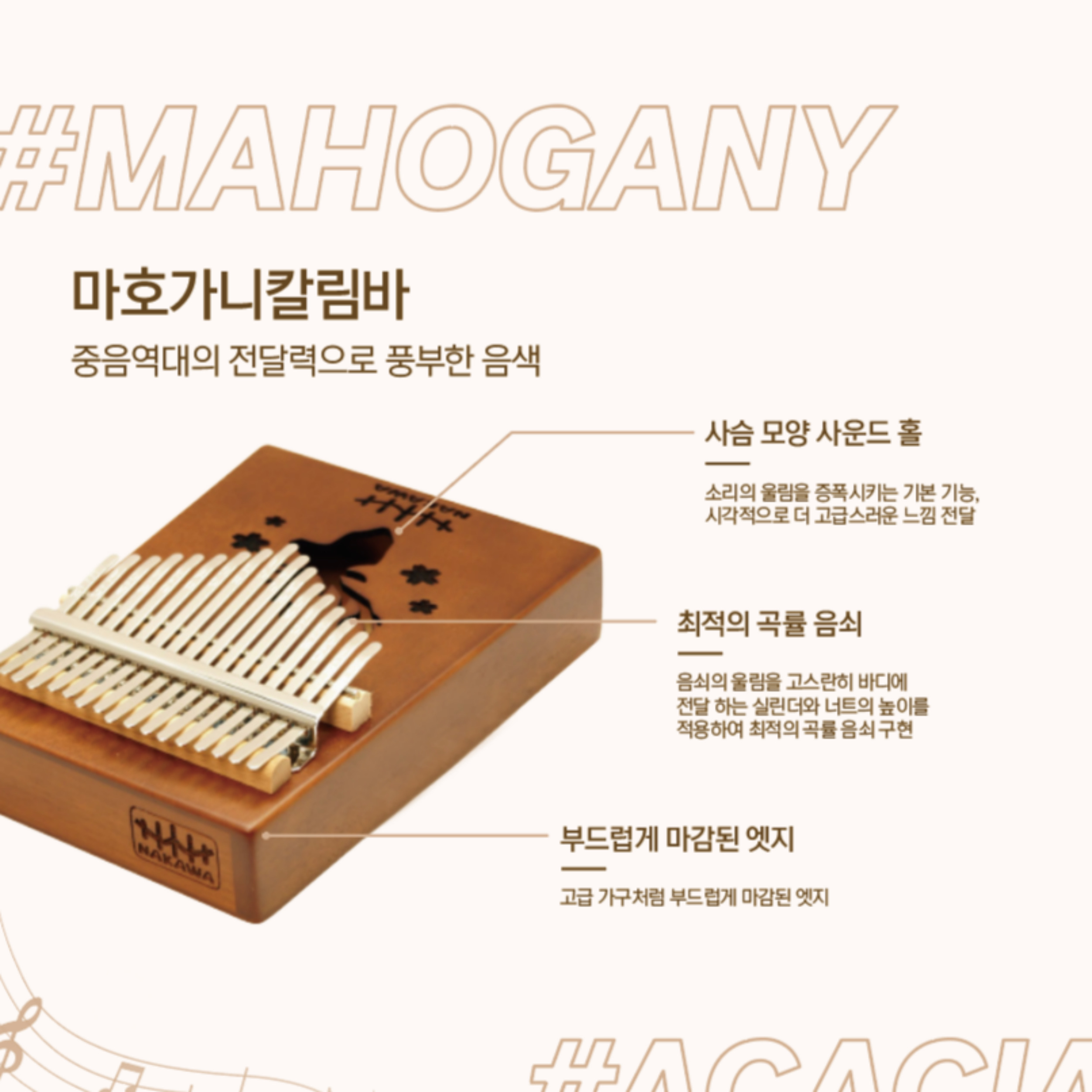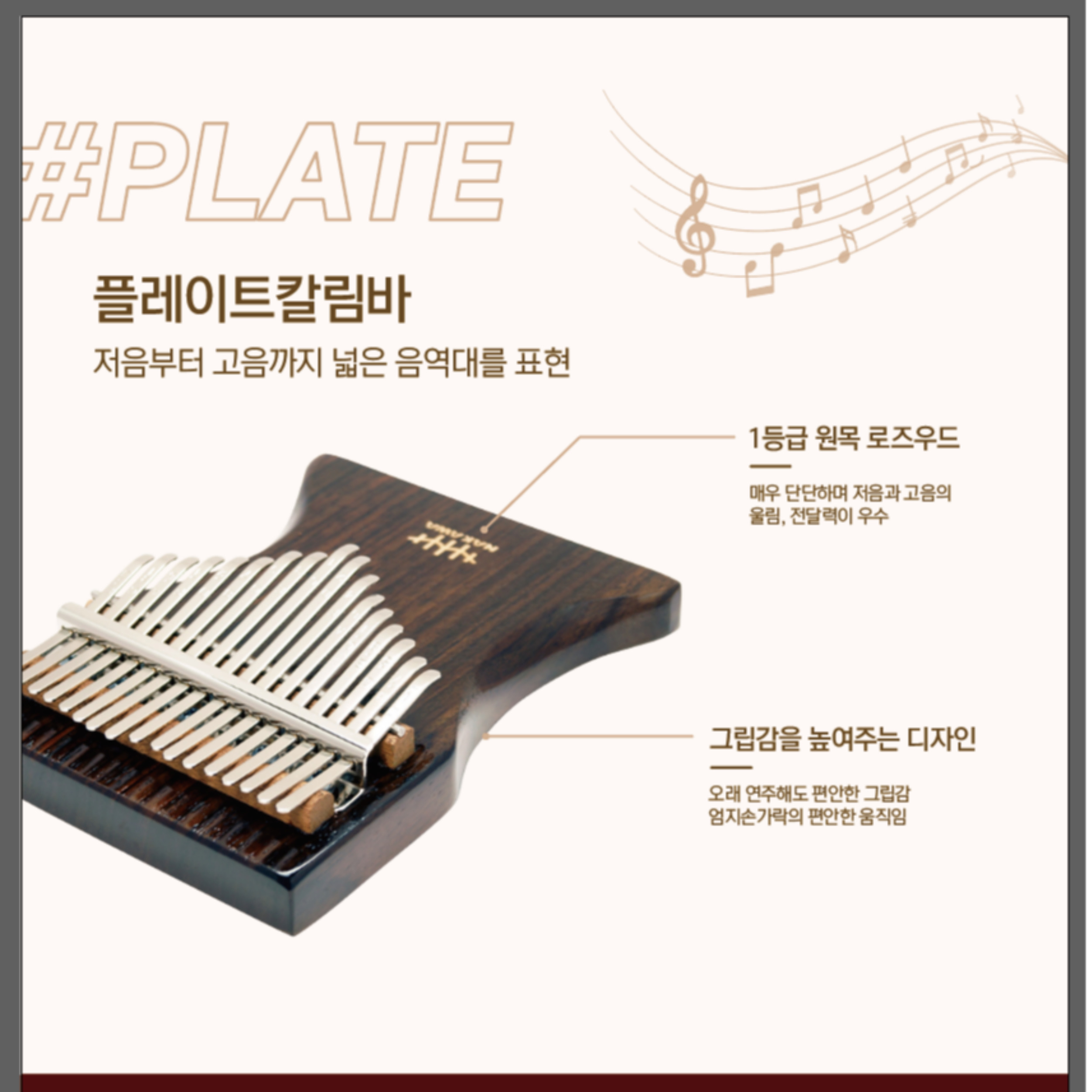 플레이트 칼림바는 저음부터 고음까지 넓은 음역대를 표현하기에 용이한 칼림바로 1등급 원목인 로즈우드를 활용하여 매우 단단하고 울림과 전달력이 우수한 상품입니다.